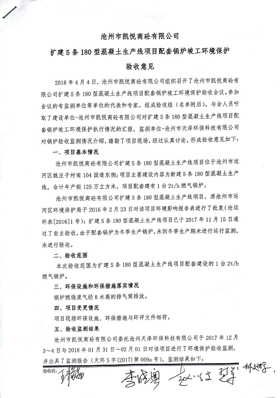 當前位置:網(wǎng)站首頁 〉新聞中心 〉詳細信息根據(jù)2017年10月1日開始實施的《建設項目環(huán)境保護管理條例》的相關規(guī)定,2017年11月15日滄州市凱悅商砼有限公司組織召開了《擴建5條180型混凝土生產(chǎn)線項目配套鍋爐竣工環(huán)境保護驗收》技術評估會,滄州市運河區(qū)環(huán)境保護局、環(huán)評編制單位、環(huán)境監(jiān)測單位、施工單位及特邀專家組成。驗收組對項目進行了實地查看,檢查了項目環(huán)境建設和運行情況,聽取了各單位對該項目的竣工驗收報告,在充分討論后認為本項目在建設過程中基本執(zhí)行了國家建設項目環(huán)境管理制度以及“環(huán)保設施與主題工程同時設計、同時施工、同時投產(chǎn)使用”的規(guī);建設單位落實了環(huán)評報告及其批復要求的環(huán)境影響治理措施,減緩了項目建設運營中的主要負面環(huán)境影響,同意通過竣工環(huán)境保護驗收。