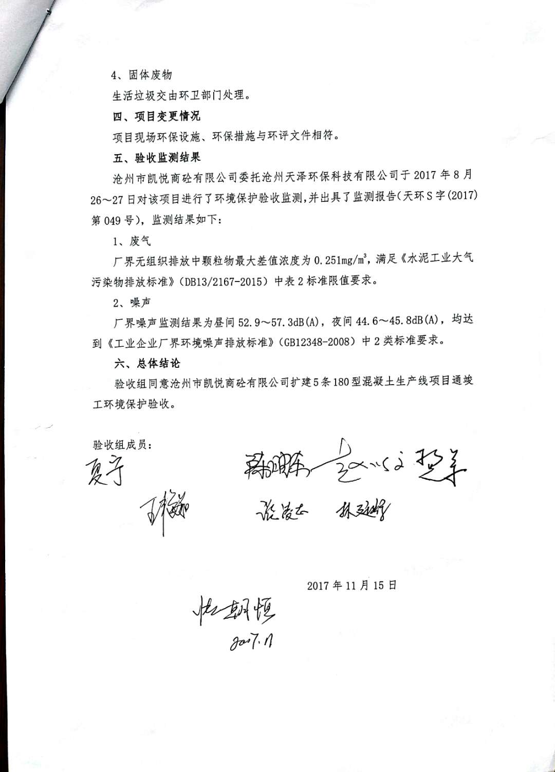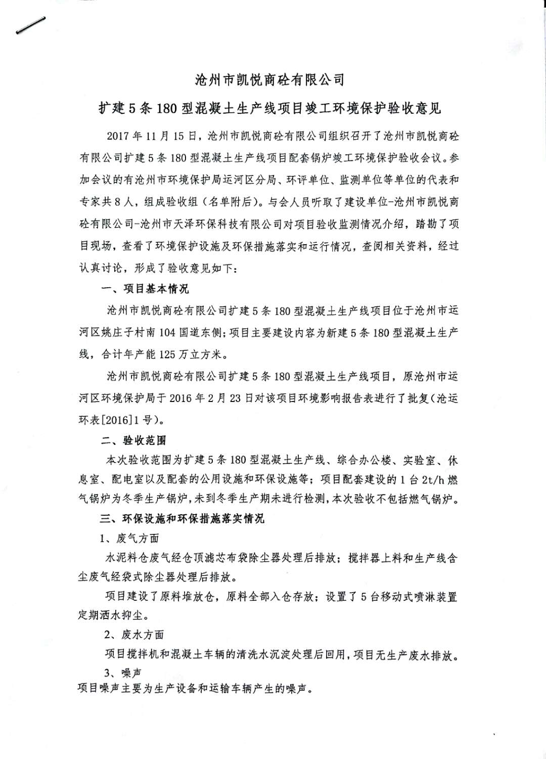 當(dāng)前位置:網(wǎng)站首頁(yè) 〉新聞中心 〉詳細(xì)信息根據(jù)2017年10月1日開始實(shí)施的《建設(shè)項(xiàng)目環(huán)境保護(hù)管理?xiàng)l例》的相關(guān)規(guī)定,2017年11月15日滄州市凱悅商砼有限公司組織召開了《擴(kuò)建5條180型混凝土生產(chǎn)線項(xiàng)目竣工環(huán)境保護(hù)驗(yàn)收》技術(shù)評(píng)估會(huì),滄州市運(yùn)河區(qū)環(huán)境保護(hù)局、環(huán)評(píng)編制單位、環(huán)境監(jiān)測(cè)單位、施工單位及特邀專家組成。驗(yàn)收組對(duì)項(xiàng)目進(jìn)行了實(shí)地查看,檢查了項(xiàng)目環(huán)境建設(shè)和運(yùn)行情況,聽取了各單位對(duì)該項(xiàng)目的竣工驗(yàn)收?qǐng)?bào)告,在充分討論后認(rèn)為本項(xiàng)目在建設(shè)過(guò)程中基本執(zhí)行了國(guó)家建設(shè)項(xiàng)目環(huán)境管理制度以及“環(huán)保設(shè)施與主題工程同時(shí)設(shè)計(jì)、同時(shí)施工、同時(shí)投產(chǎn)使用”的規(guī);建設(shè)單位落實(shí)了環(huán)評(píng)報(bào)告及其批復(fù)要求的環(huán)境影響治理措施,減緩了項(xiàng)目建設(shè)運(yùn)營(yíng)中的主要負(fù)面環(huán)境影響,同意通過(guò)竣工環(huán)境保護(hù)驗(yàn)收。